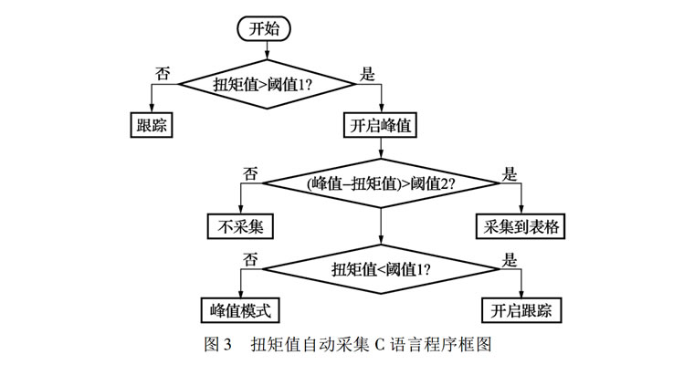 大多數(shù)儀表只具有顯示功能不具有數(shù)據(jù)采集和分析功能,校準(zhǔn)人員在校準(zhǔn)時(shí),一邊操作校準(zhǔn)裝置,一邊用筆記錄校準(zhǔn)數(shù)據(jù)。這樣不但工作效率低還容易出錯(cuò)。為了方便校準(zhǔn)員做記錄,儀表專門(mén)設(shè)計(jì)了數(shù)據(jù)采集功能,采集表格形式完全按照 JGJ707—2014《扭矩扳子檢定規(guī)程》的表格形式[7,這樣方便后面的計(jì)算和出證書(shū)。儀表采用具有C語(yǔ)言功能的觸摸屏作為顯示終端。校準(zhǔn)人員可以通過(guò)設(shè)定最大扭矩值和采集觸發(fā)值, 實(shí)現(xiàn)扭矩值的自動(dòng)采集。并根據(jù)采集數(shù)據(jù)進(jìn)行平均值和示值相對(duì)誤差和示值重復(fù)性的計(jì)算。C 語(yǔ)言程[8]框圖如圖3 所示。其中閾值1表示進(jìn)入峰值模式的判斷條件,閾值2表示采集峰值判斷條件。當(dāng)扭矩值超過(guò)閾值 1,儀表自動(dòng)從跟蹤模式變?yōu)榉逯的J健.?dāng)峰值和當(dāng)前的扭矩值之差大于閾值 2 時(shí),程序會(huì)將峰值自動(dòng)采集到表格中,然后解除峰值功能。閾值1和2的設(shè)定根據(jù)智能傳感器的量程來(lái)計(jì)算得到。本設(shè)備中閾值1為傳感器滿量程值的5%,閾值2為滿量程值的2/3。