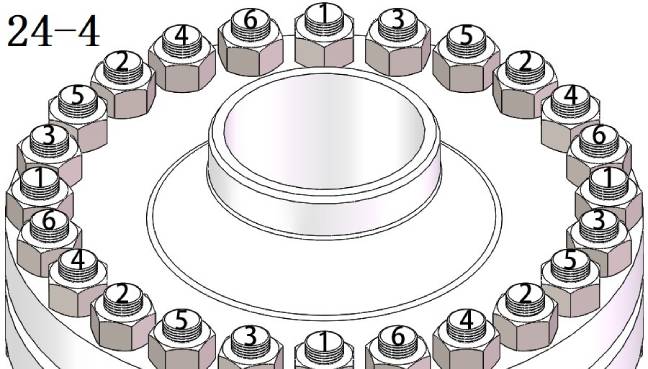 首先,我們來優(yōu)先了解一下四同步液壓扳手預(yù)緊管殼式換熱器法蘭螺栓的螺栓編序?梢詤⒄障聢D,將法蘭螺栓總數(shù)平分為四部分,每一部分選第一顆作為定位螺栓編序號“1”,編號“2”取每組最中間螺栓,下來的編號都是取每次平分之后的中間螺栓依次編號直到編完為止。