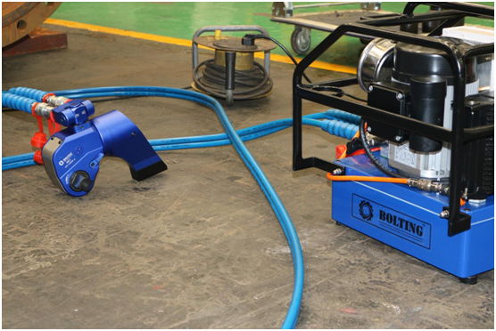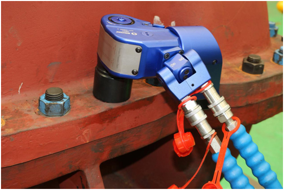 2、所有高精度設(shè)備,在螺栓終緊過程中,都應(yīng)該是對角或者四角施加扭矩,避免受力不均勻造成的法蘭變形或者密封受損,避免泄露,如采用電動(dòng)扭矩扳手或者氣動(dòng)扭矩扳手,需要兩個(gè)操作工程師用兩把電動(dòng)扭矩扳手對螺栓進(jìn)行擰緊工作,時(shí)機(jī)配合等都需要相當(dāng)默契,那么四同步的情況下呢?成本相對于液壓扳手來說更高,采用液壓扳手則避免了這個(gè)問題,配置的電動(dòng)液壓泵為四同步,同一臺(tái)動(dòng)力源,不可能一臺(tái)扳手是50Mpa,另一臺(tái)48Mpa,后期有需要增加到四同步,僅需再配兩把液壓扳手和套筒即可,無需再購買液壓泵站。