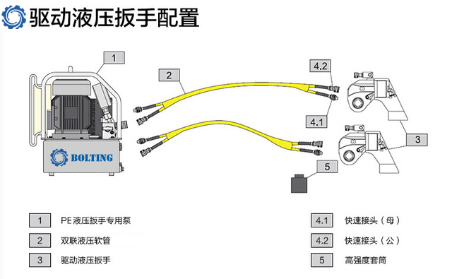 液壓扳手專(zhuān)用泵是液壓扳手的動(dòng)力單元.。液壓扳手專(zhuān)用泵屬于高壓泵,最高工作壓力一般為70MPa,常見(jiàn)的有電動(dòng)液壓泵和氣動(dòng)液壓泵。如下液壓扳手配置圖: