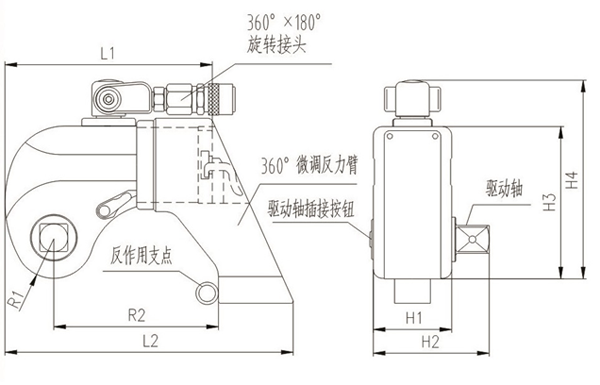 液壓扳手的工作頭主要由三部分組成,框架(也叫殼體),油缸和傳動部件。油缸輸出力,油缸活塞桿與傳動部分組成運(yùn)動副, 油缸中心到傳動部件中心這個距離是液壓扳手放大力臂,油缸出力乘以力臂,就是液壓扳手理論輸出扭矩, 由于摩擦阻力存在, 液壓扳手實(shí)際輸出扭矩要小于理論輸出扭矩。