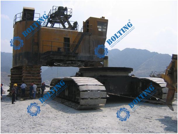 電鏟是千萬噸級(jí)露天礦山主要采掘設(shè)備之一,生產(chǎn)率高,作業(yè)率高,操作成本低,是目前采礦業(yè)公認(rèn)的機(jī)型。電鏟由行走裝置、回轉(zhuǎn)裝置、工作裝置、潤(rùn)滑系統(tǒng)、供氣系統(tǒng)組成。鏟斗是電鏟的主要部件,它直接承受被挖掘礦石的作用力,因而磨損較大,斗桿也是電鏟挖掘過程中的主要部件之一,它的作用是連接和支持鏟斗,并將推壓作用傳送給鏟斗,鏟斗在推壓和提升力的共同作用下完成挖掘土壤的動(dòng)作;其行走機(jī)構(gòu)中最為核心的履帶裝置,經(jīng)過相關(guān)的傳動(dòng)機(jī)構(gòu)最終使其在地面直接移動(dòng)!