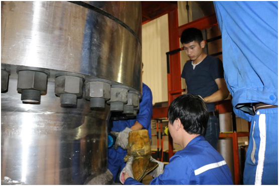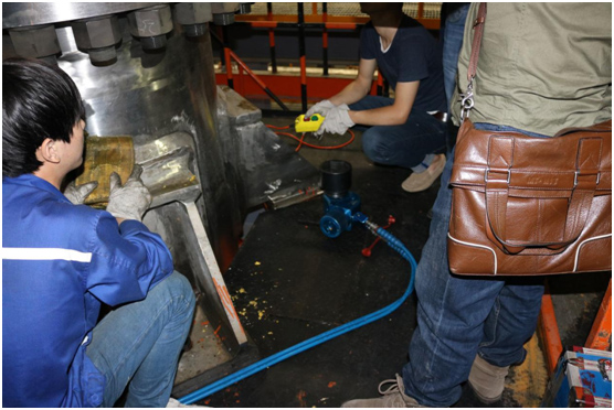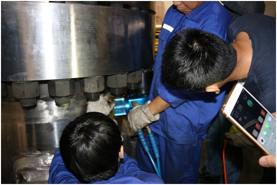 現(xiàn)場(chǎng)工作人員非常認(rèn)真地與波霆機(jī)械工程師進(jìn)行交流、探討以及學(xué)習(xí)液壓扳手的正確操作方法。培訓(xùn)剛剛結(jié)束大家就開(kāi)始忙碌起來(lái),對(duì)應(yīng)兩個(gè)法蘭現(xiàn)場(chǎng)工人分成兩組,每組三個(gè)人,采用兩同步拆卸螺栓。